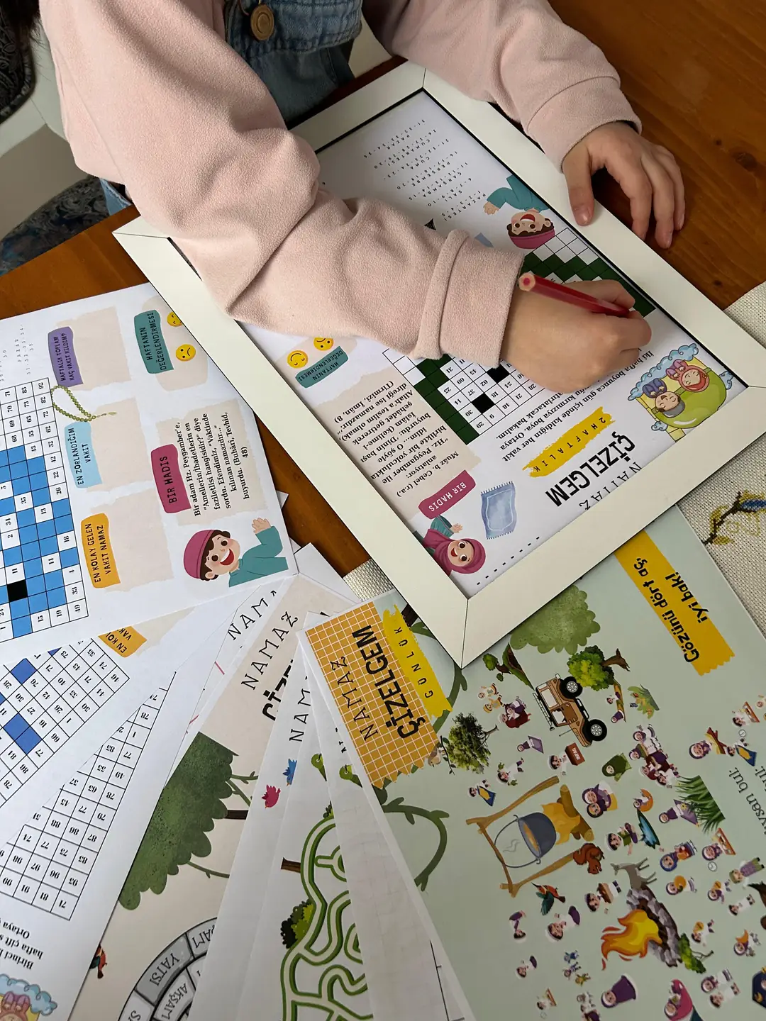 Bir adet mdf çerçeve ile birlikte gelen çizelge seti; çocukların namaza alışmasını kolaylaştıran, motive edici ve bolca eğlenceli bir içerik sunar.